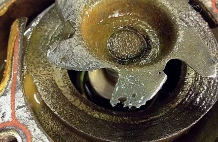 - Seal failure. The pump has two seals — an oil seal and a rubber cuff/gasket. It is the seal (gasket) that fails most often. This happens for two reasons: natural wear (hardening of the rubber) and the use of low-quality cheap antifreeze without appropriate protective additives, or even just water. In the long run, these fluids corrode the gasket, causing it to leak, which leads firstly to a drop in the coolant level in the system, and secondly to antifreeze or water entering the bearing, washing out the grease and causing the troubles described above.