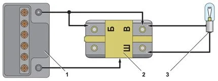 Diagram for an external regulator (G-222): 1 — Battery; 2 — regulator; 3 — lamp.