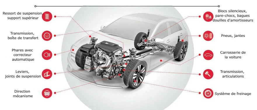 - Usure accrue des pneus, des coussinets en caoutchouc, des silent blocs, des pare-chocs et des ressorts. et d'autres éléments de la suspension de la voiture.
