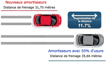 - Augmentation de la distance de freinage. Ce facteur est causé par le même balancement lors du freinage. Lorsque l'amortisseur cesse d'amortir les vibrations, la voiture abaisse et soulève périodiquement la partie avant de la carrosserie pendant le freinage. De ce fait, la charge sur les roues avant est réduite, ce qui diminue l'efficacité du freinage.
