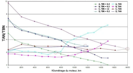 Au fur et à mesure de l'utilisation du moteur, et donc de l'huile, l'indice d'alcalinité diminue et l'indice d'acidité augmente. Par conséquent l'huile à un certain kilométrage (la ressource moyenne de 10 000 miles) l'huile a complètement épuisé sa ressource, et la suite de son fonctionnement ne fait que ruiner le moteur.