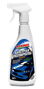 Данное средство Runway позиционируется как быстрая полироль-воск. Пользуется большой популярностью у автовладельцев, поскольку имеет невысокую цену и достаточно большую упаковку. Распыляется с помощью ручного триггера-разбрызгивателя. В состав входит воск карнауба, средство является неабразивным. Позволяет очистить ЛКП машины, удалить мелкие повреждения и защитить от их дальнейших появлений. Долговечность можно охарактеризовать как среднюю, повторно наносить средство нужно через каждые 4…6 моек кузова машины. Однако учитывая его невысокую цену, это вполне приемлемо.