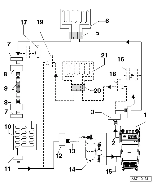 В автомобилях с расширительной трубкой и аккумулятором-осушителем эти узлы необходимо снять. Магистрали, которые были освобождены при снятии расширительной трубки, снова соединить. Концы магистралей, которые были соединены с аккумулятором-осушителем, снова соединяются друг с другом при помощи двух адаптеров и шланга VAS 6338/31 (из комплекта адаптеров для легковых а/м VW/Audi VAS 6338/1).