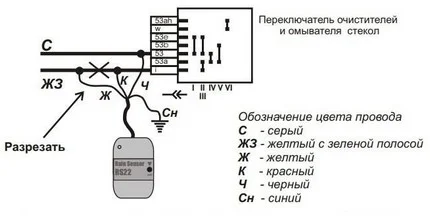 - провод контроля (черный) соединяется с проводом, ответственным за работу прерывистого режима стеклоочистителя (обычно на нем 0 В при парковке щеток и +12 В при движении).