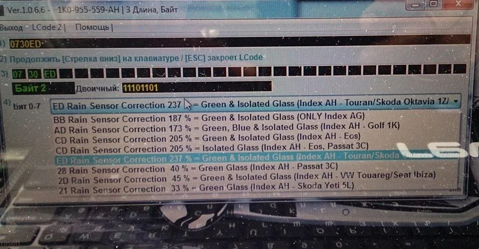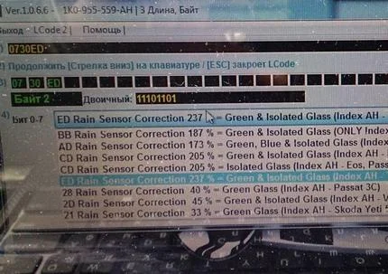 Калибровка производится путем коррекции чувствительности сенсора, исходя из свойств лобового стекла в настройках ЭБУ, поэтому чаще всего она применяется именно после замены стекла или датчика. Через VCDS или другое аналогичное ПО нужно выбрать меню настройки параметров датчика дождя, где и прописать в соответствующем поле нужный параметр. Его можно выбрать как среди готовых шаблонов, предложенных программой, так и методом подбора.