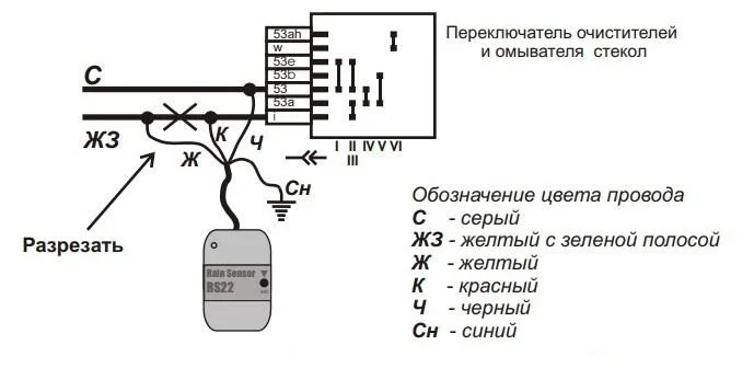 Способ и схема подключения, а также тип совместимого датчика (ДДА-15, ДДА-25 и т. д.) напрямую зависит от конкретной модели автомобиля. К примеру, для Hyundai Creta, а также других моделей Hyundai и Kia, в которых управление работой стеклоочистителей организовано через отдельный провод, подойдёт датчик ДДА-70. Распиновка датчика дождя RS-22 для ВАЗ показана на иллюстрации ниже.