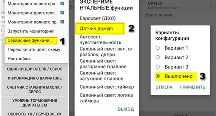 - Через OBD-II. Деактивация датчика дождя в настройках ЭБУ – наиболее удобный способ. Делается она так же, как и активация (см. предыдущий подраздел), через диагностический сканер и ПО под вашу марку для него.