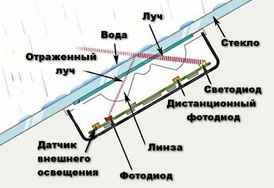 Датчик дождя реагирует на изменение преломления ИК-лучей стеклом при попадании воды. Фотодиод регистрирует эти изменения и подает контроллеру сигнал на включение дворников. На современных авто чувствительность датчика обычно регулируется кольцом (шайбой) на переключателе, а скорость движения щеток зависит от количества попадающей в зону датчика воды: чем больше – тем быстрее.