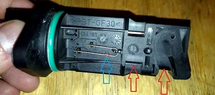 Резистор измеряющий температуру воздуха (ДТВ) — отмечен синей стрелкой, и чувствительный элемент измеряющий массовый расход воздуха (ДМРВ) — красными стрелками отмечены потоки воздуха, воздействующие на него