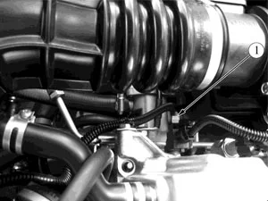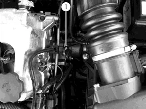 Расположение датчика температуры охлаждающей жидкости в подкапотном пространстве автомобилей семейства LADA KALINA (при снятом воздушном фильтре): 1 — датчик температуры охлаждающей жидкости