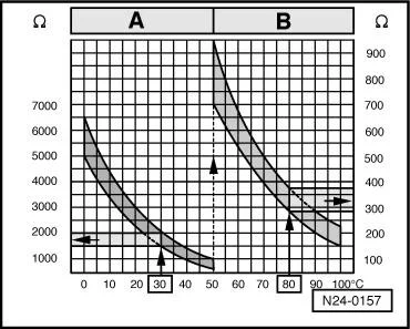 Область -A- показывает значения сопротивления для диапазона температур 0… 50 °C, область B — значения для диапазона температур 50… 100 °C.