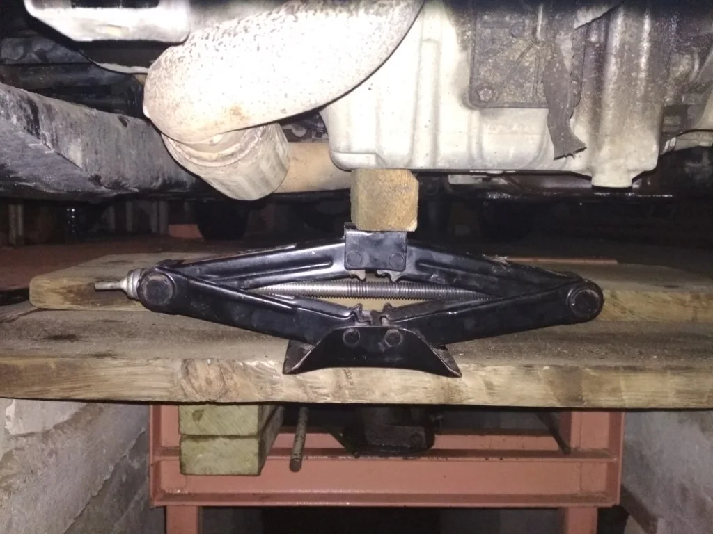 Устанавливаем домкрат под двигатель, максимально ближе к правой стороне. И через деревянную прокладку, немного приподнимаем двигатель, тем самым разгружаем правую опору.
