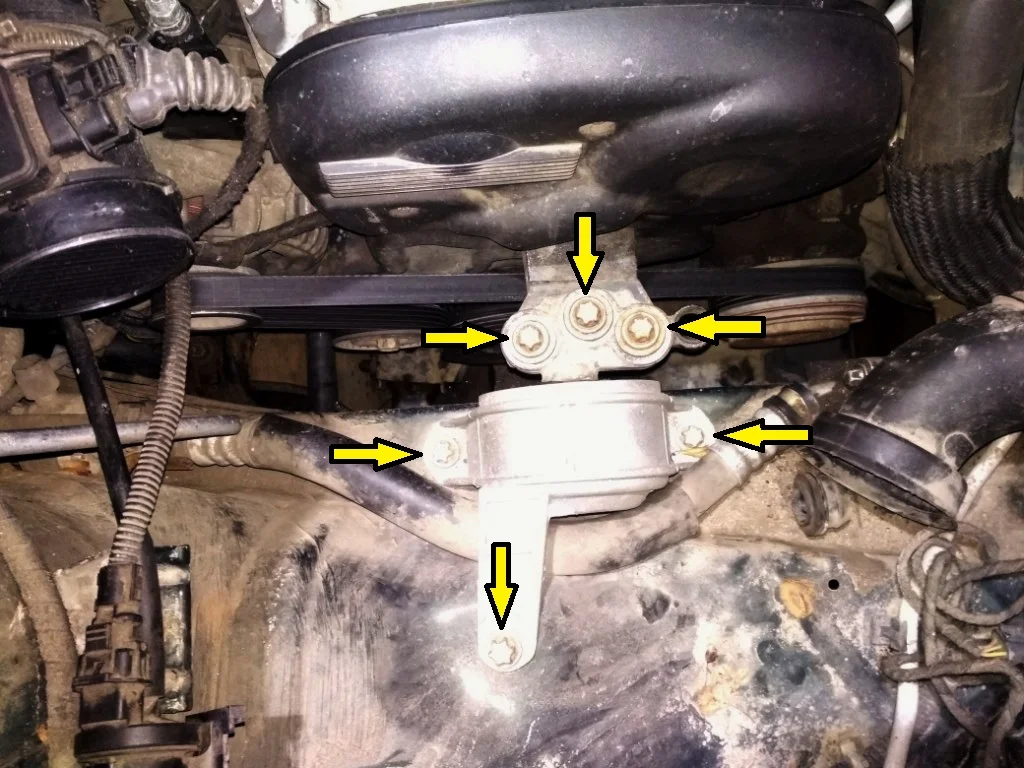 - Откручиваем ключом TORX E11 три болта крепления опоры к двигателю и три болта крепления опоры к кузову автомобиля.