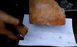- Вторым куском кирпича нужно тесать по ровной поверхности первого кирпича с тем, чтобы на бумагу попадала получаемая в результате трения кирпичная крошка.