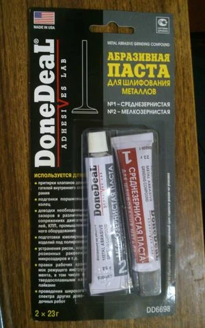 | Паста абразивная притирочная Done Deal | В одной упаковке имеются два тюбика со среднезернистой и мелкозернистой притирочной пастами. С помощью данного средства можно обрабатывать любые клапана и их седла (посадочные места). Одна и вторая пасты могут использоваться как последовательно одна за другой, так и отдельно. Средство позиционируется как профессиональное, поэтому может быть использовано в автомастерских | 2×23 грамм | 300 рублей |