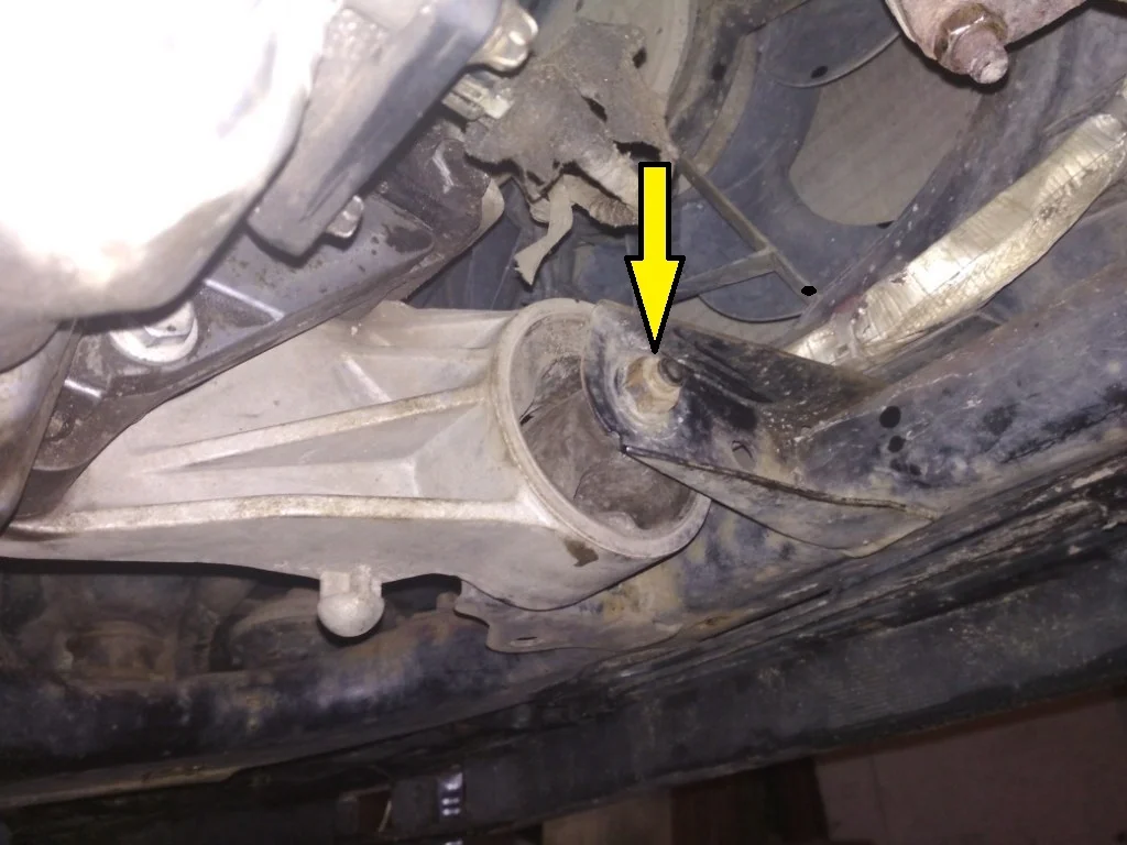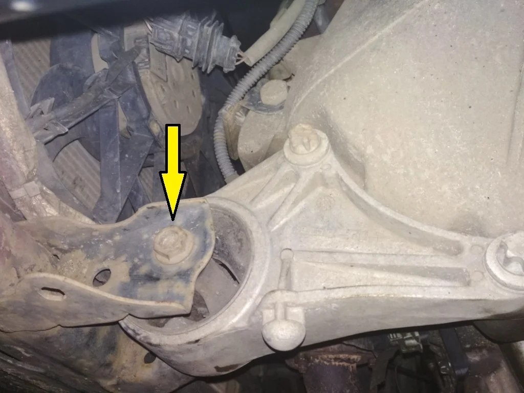 - Далее ключом TORX Е13 откручиваем два болта крепления передней опоры к коробке переключения передач.