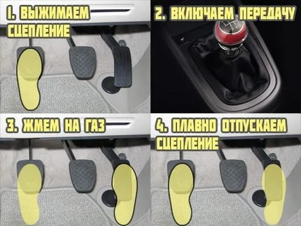 - когда сцепление “схватило” нужно полностью отжать педаль сцепления и одновременно добавить газу для разгона машины (можно газ даже чуть раньше добавить).