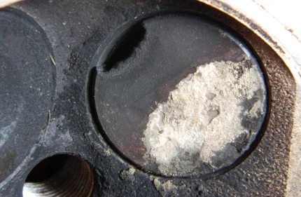 - Проблемы с системой охлаждения. Если циркуляция охлаждающей жидкости в ГБЦ нарушена или антифриз просто не справляется с отводом тепла, в результате детали головки перегреваются, а клапана и их седла могут прогореть.