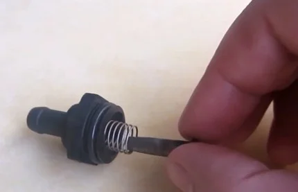 - Плотно закройте пальцем входное отверстие клапана. В исправной детали это действие сопровождается щелчком и ощущается разряжение – палец «прилипнет» к отверстию.