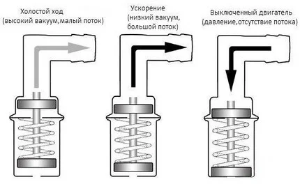 Принцип действия клапана PCV основан на изменении давления на входе. Условно можно выделить 4 основных состояния КВКГ по степени открытия и количеству проходящих картерных газов.
