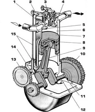 Устройство: 1 — ГБЦ; 2 — коромысло; 3 — свечи зажигания; 4 — выпускной клапан; 5 — впускной клапан; 6 — цилиндр; 7 — поршень; 8 — кольцо; 9 — шатун; 10 — маховик; 11 — картер; 12 — коленвал; 13 — приводная шестерня; 14 — распределительный вал; 15 — передаточные элементы.