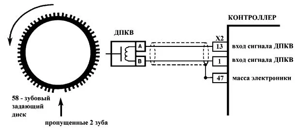 Задающий диск имеет 58 зубьев с шагом в шесть градусов, а также «впадину» образованную двумя пропущенными зубьями — таким образом достигается синхронизация. Для установки коленчатого вала в положение 114 градусов до верхней мертвой точки первого и четвертого цилиндров совмещают середину, первого после впадины зуба, с осью ДПКВ.