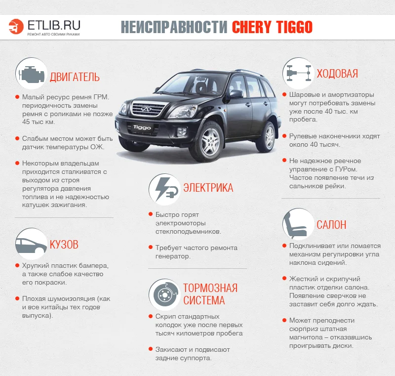 Но, несмотря на свои не многочисленные неисправности, Чери Тиго довольно не плохая машина и среди моделей Chery является одной из самых надежных. А большинство недостатков легко устраняются даже своими руками. Так же стоит заметить, что большинство вышеописанных неисправностей не является закономерным для всех владельцев, поскольку автомобиль собирался не на одном заводе и выпускался не один год, поэтому некоторые недоработки Tiggo могут касаться лишь некоторых моделей, а не всего ряда в целом.