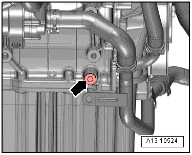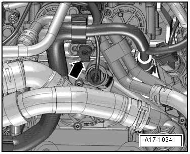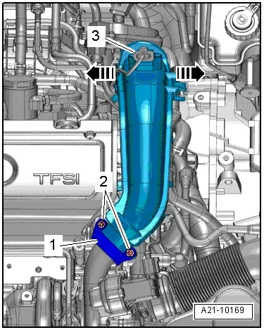 - Разблокировать защелки стрелки и снять воздуховодную трубку сначала с блока управления дроссельной заслонки -J338-, затем с турбонагнетателя;