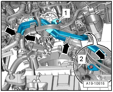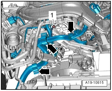 - Отсоединить шланг охлаждающей жидкости 1 к кожуху двигателя;