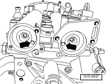 - Установить коленвал в направлении вращения двигателя в „ВМТ“.„ВМТ“ = максимальное измеренное значение индикатором часового типа. Отверстия стрелки в распредвалах должны располагаться так, как показано на рисунке. При необходимости повернуть коленчатый вал еще на оборот (360°);