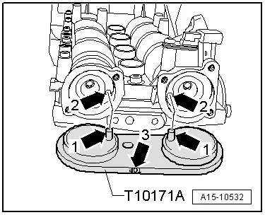 - Вставить фиксатор распредвалов T10171 A до упора в отверстия распредвалов;