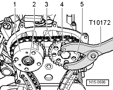 - Затянуть болт 2 фазовращателя 1 моментом 40 Нм и болт 4 звездочки распредвалов 5 моментом 50 Нм, при этом удерживать контропорой -T10172- звездочку распредвалов;