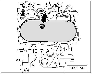 - Для крепления фиксатора распредвалов -T10171 A- с усилием вкрутить болт М6 стрелка, не затягивать;