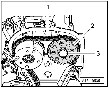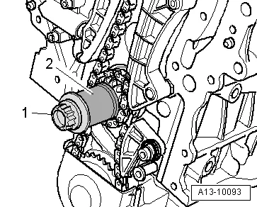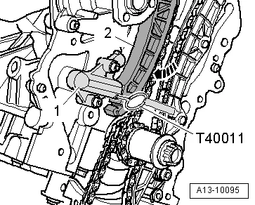- Закрепить звездочку распредвалов, для этого извлечь стопорный штифт -T40011- из натяжителя цепи 1;