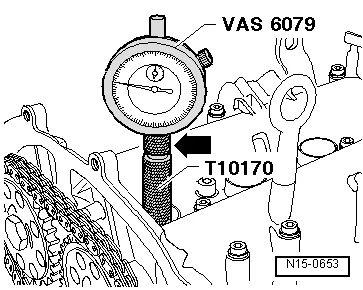 - Если не удается вставить фиксатор распредвалов T10171 A в отверстия до упора, повторить регулировку;