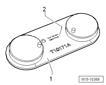 - Положить шаблон 1 на фиксатор распредвалов -T10171-, как показано на рисунке;