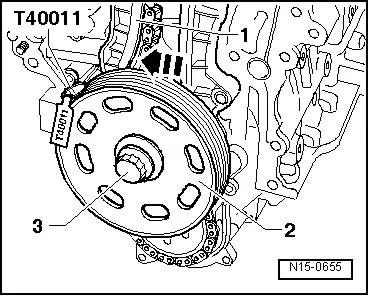 - Выкрутить винты -2- и -4- и снять звездочку -1- с цепью привода ГРМ -3-. Использовать для этого упор -T10172-;