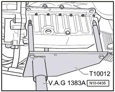- Установить кронштейн -T10012- на домкрат для двигателей и агрегатов трансмиссии -V.A.G 1383/A-;