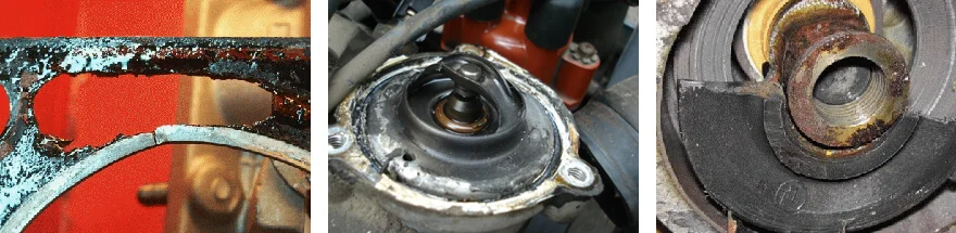 Cлева направо: пробитая прокладка ГБЦ, загрязненность термостата, поломка помпы.