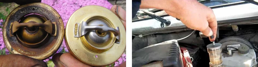 старый и новый термостаты; проверка на прорыв выхлопных газов