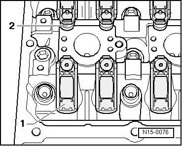 - Проверить, чтобы все роликовые рычаги клапанов были правильно установлены на концах стержней -1- и опорных элементах -2-;