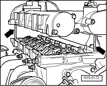 Дальнейшая сборка осуществляется в последовательности, обратной разборке. Момент затяжки болтов -стрелки- крепления крышки корпуса распредвалов (а/м с двигателями BUD, CGGA): 10 Нм.