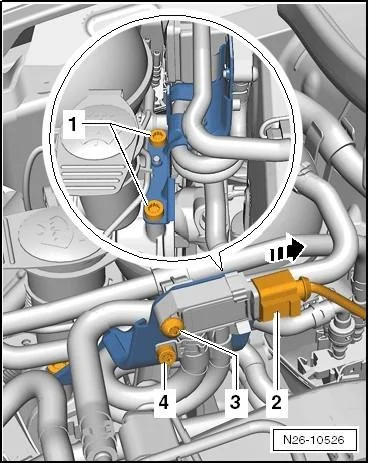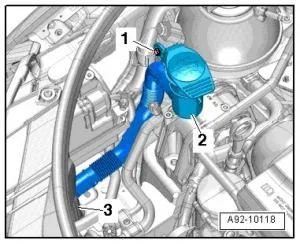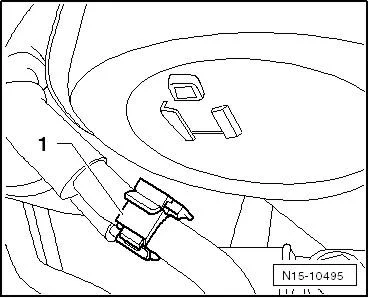 - Отсоединить провод -1- дифференциального датчика давления -G505- с держателем от верхнего кожуха зубчатого ремня;