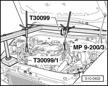 - Надеть удерживающее устройство -T30099- c подкладкой -T30099/1- и переходником -MP9-200/3- и подпереть двигатель в положении установки;