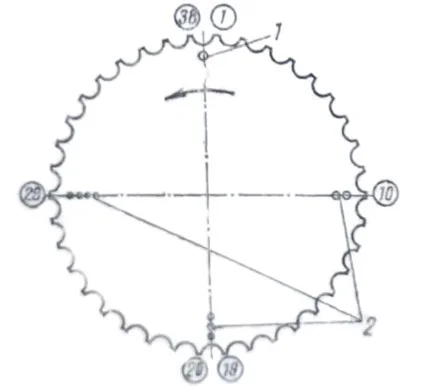 - Еще отсчитываем 10 зубьев от предыдущей метки на 29-ом зубе ставим условную метку 4 (смотреть рисунок 1). Затем проворачиваем коленвал по часовой стрелке до совпадения меток. В этом положении регулируем кулачки 2 и 5.