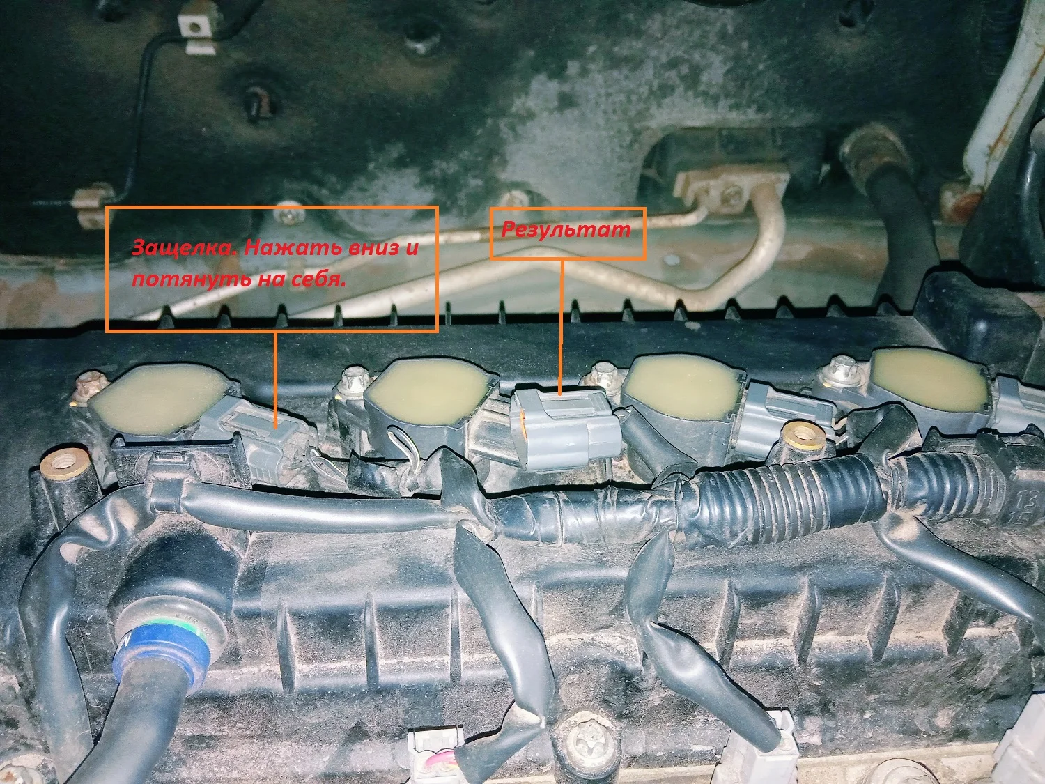 Дабы не разводить здесь много воды, скажу сразу, как узнал, что надо менять катушку. Итак, заводим двигатель, он по прежнему «троит», открываем капот, смотрим на катушки и поочередно начинаем отсоединять провода питания от контактов.