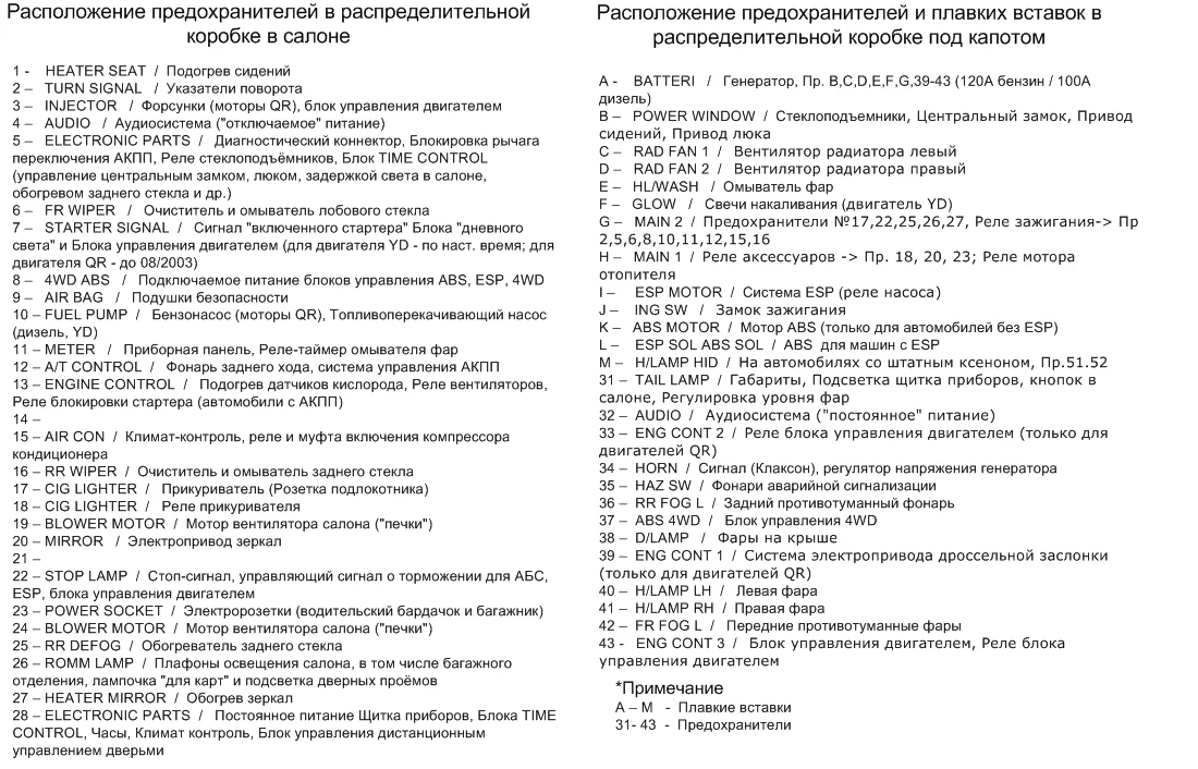 Для тех кто не разобрался в английской расшифровке (под крышкой) назначения предохранителей предлагаю ориентироваться на вот такие обозначения ниссановского блока:
