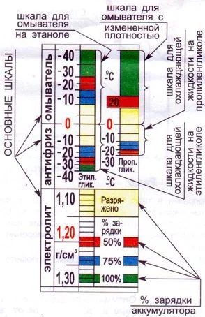 Часто у ареометров кроме обычной шкалы есть еще и цветовая разметка — например, зеленый обозначает нормальный уровень, красный — очень низкий, и т.п.