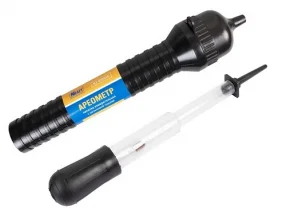 Стеклянный универсальный ареометр для электролита и антифриза с измерительной колбой. В комплекте есть груша и резиновый ниппель для забора жидкости