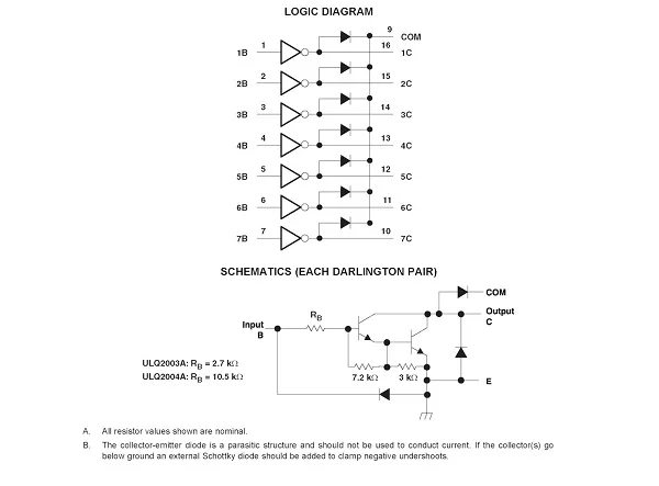 Микросхему можно проверить мультиметром либо осциллографом. Для этого устройство необходимо подключить к соответствующим разъемам, после чего включается кнопка блокировки или разблокировки дверей. Если показания мультиметра не меняются — проблема в микросхеме ULQ2003A(Q). Это переключатель высоковольтного типа, который работает на транзисторах Дарлингтона (на фото “Связи реле управления” показан стрелкой снизу). Ниже представлена его схема: